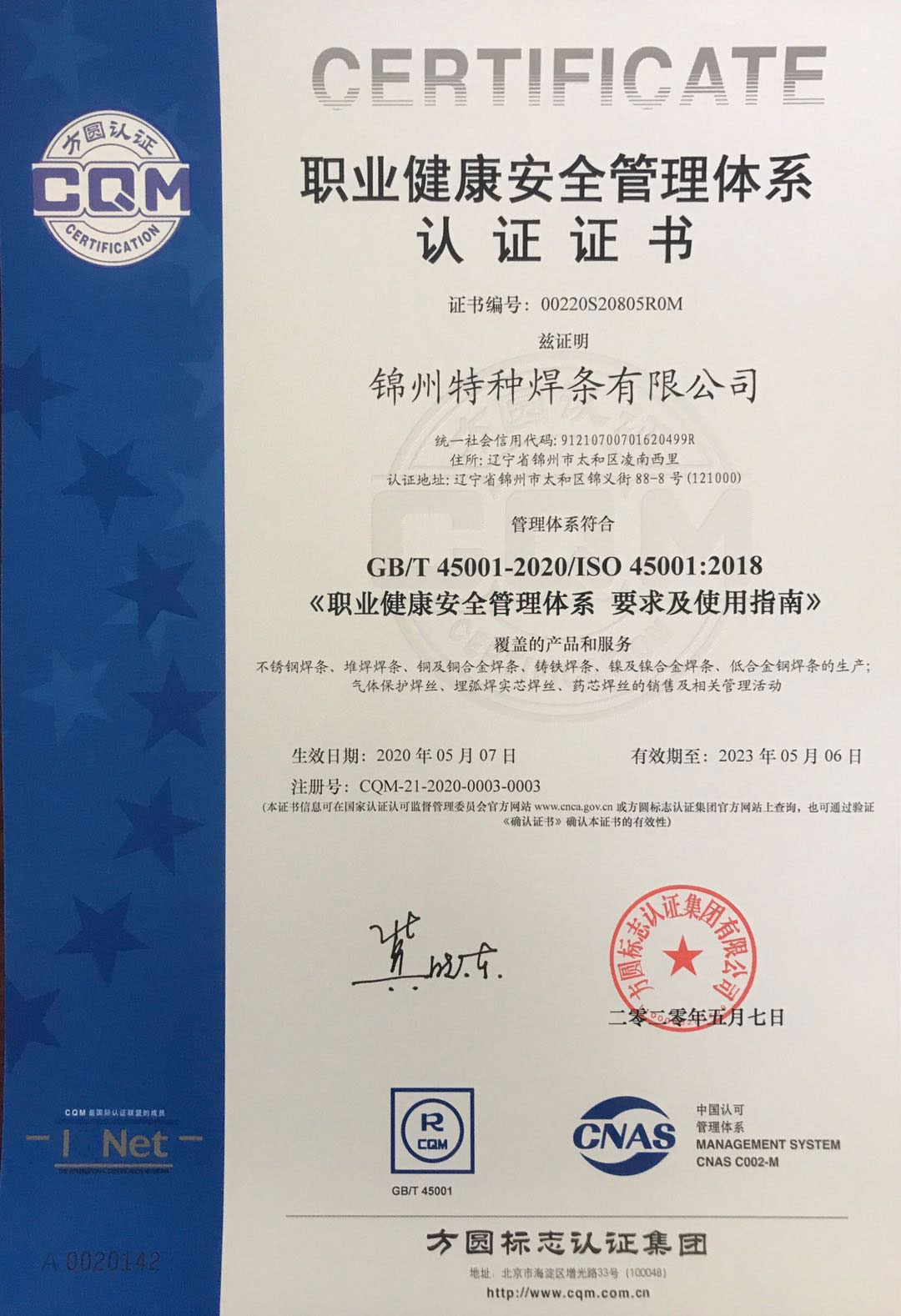 認(rèn)證名稱:職業(yè)健康安全管理體系認(rèn)證證書(shū)